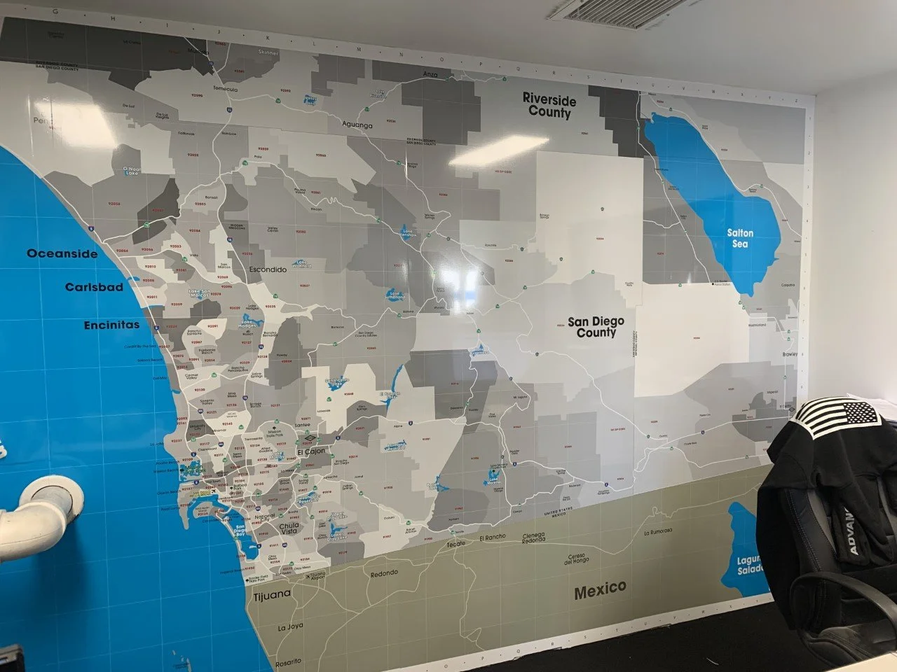 Wall wraps are an excellent way to personalize your office space. Using high resolution photos, custom artwork or your companies branding we can bring your work space to life with wall wraps. Give us your ideas and let us put together a layout that will truly turn your office or showroom into a one of a kind experience. At San Diego ProGraphix we can cover as little or as much of a wall as you would like. We also offer dry erase wraps that are good for dispatch maps or conference rooms. Most of our wall wraps are laminated with a matte lamination to minimize glare. With digital mock ups displaying your wall wraps we will show you what we can do to customize your office.